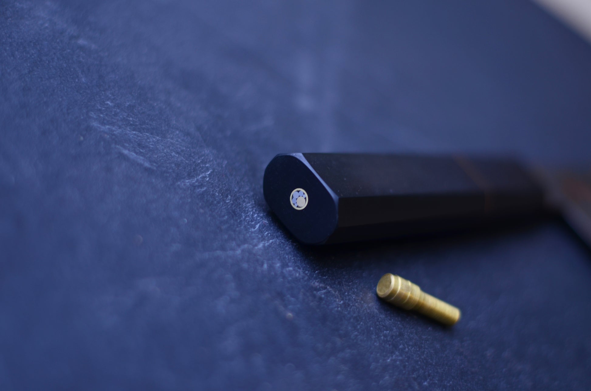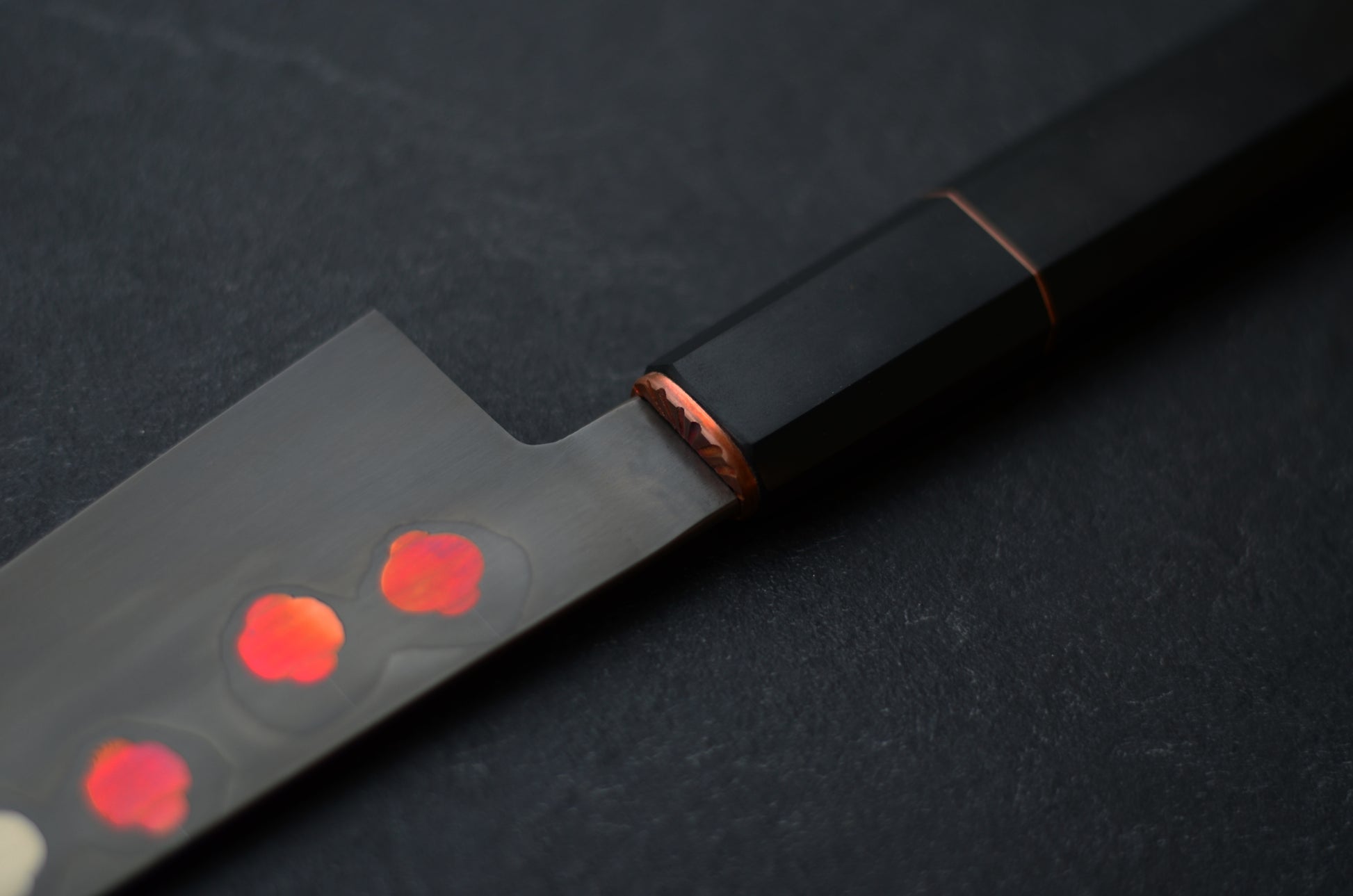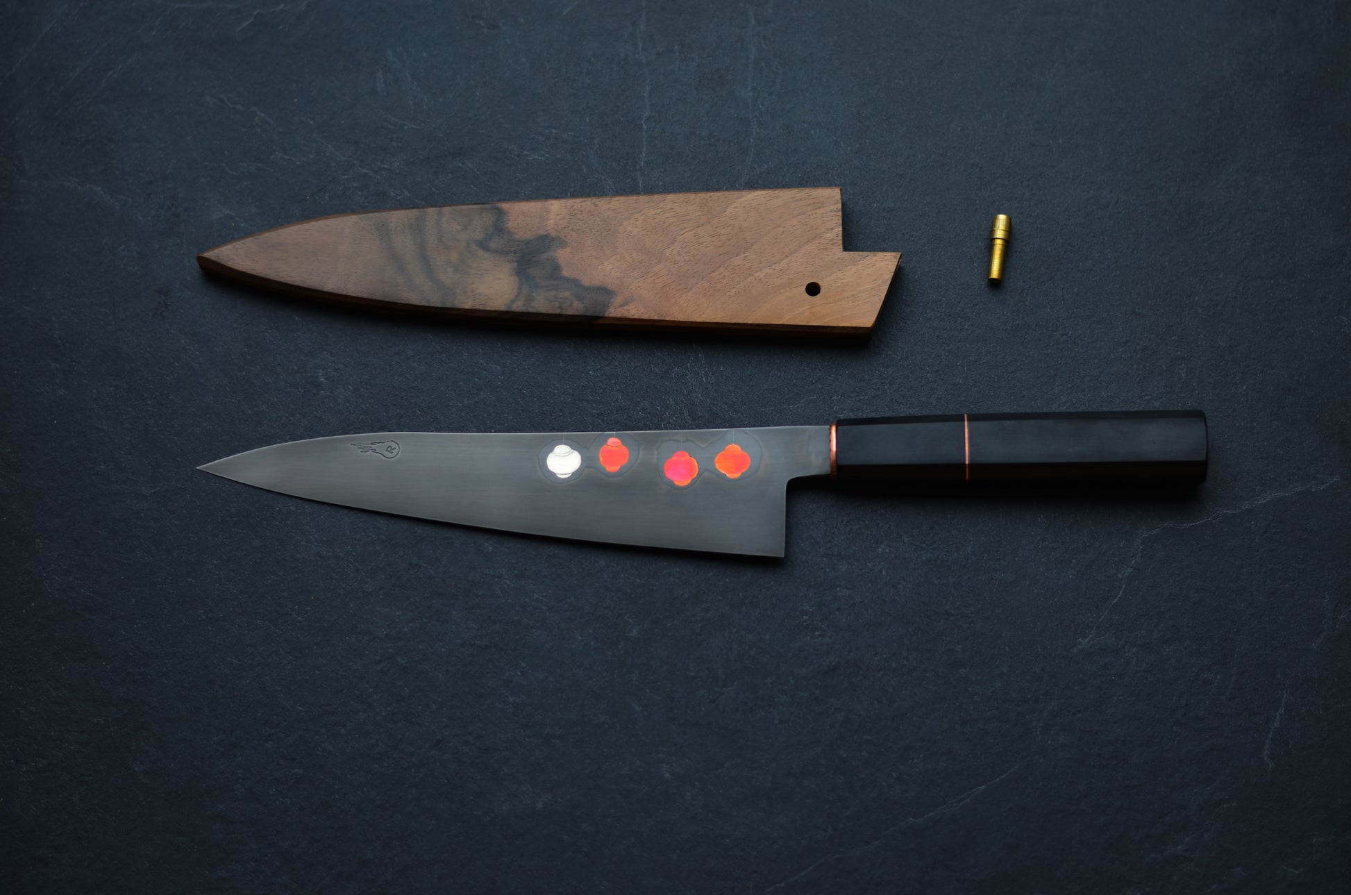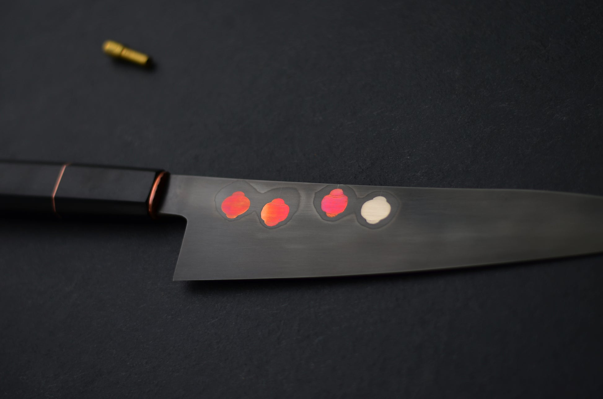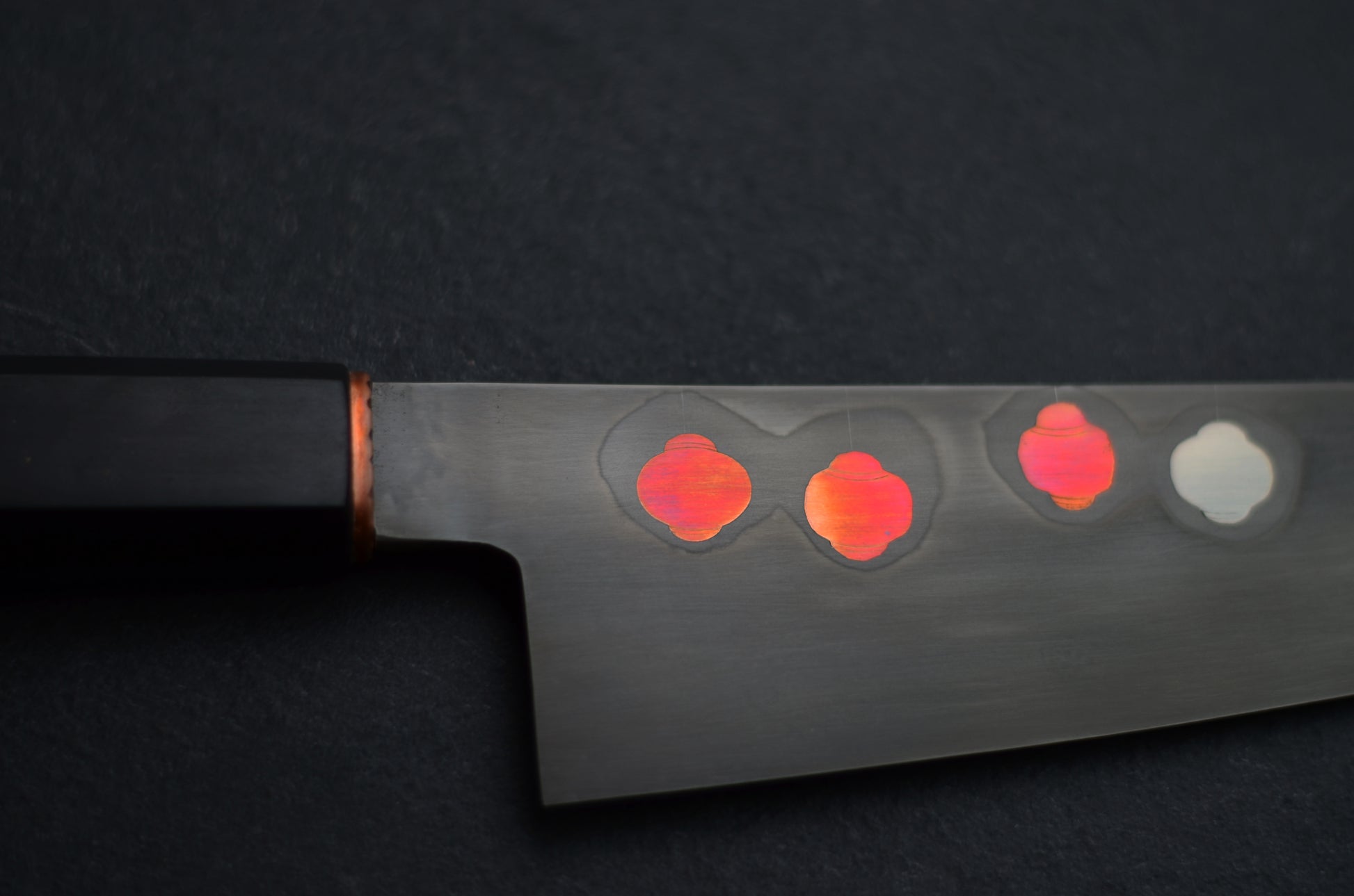 La lame de ce couteau dispose d'inserts en cuivre et nickel. Une trempe sélective à l'argile, menée selon la méthode traditionnelle japonaise, forme un halo autour des lanternes.