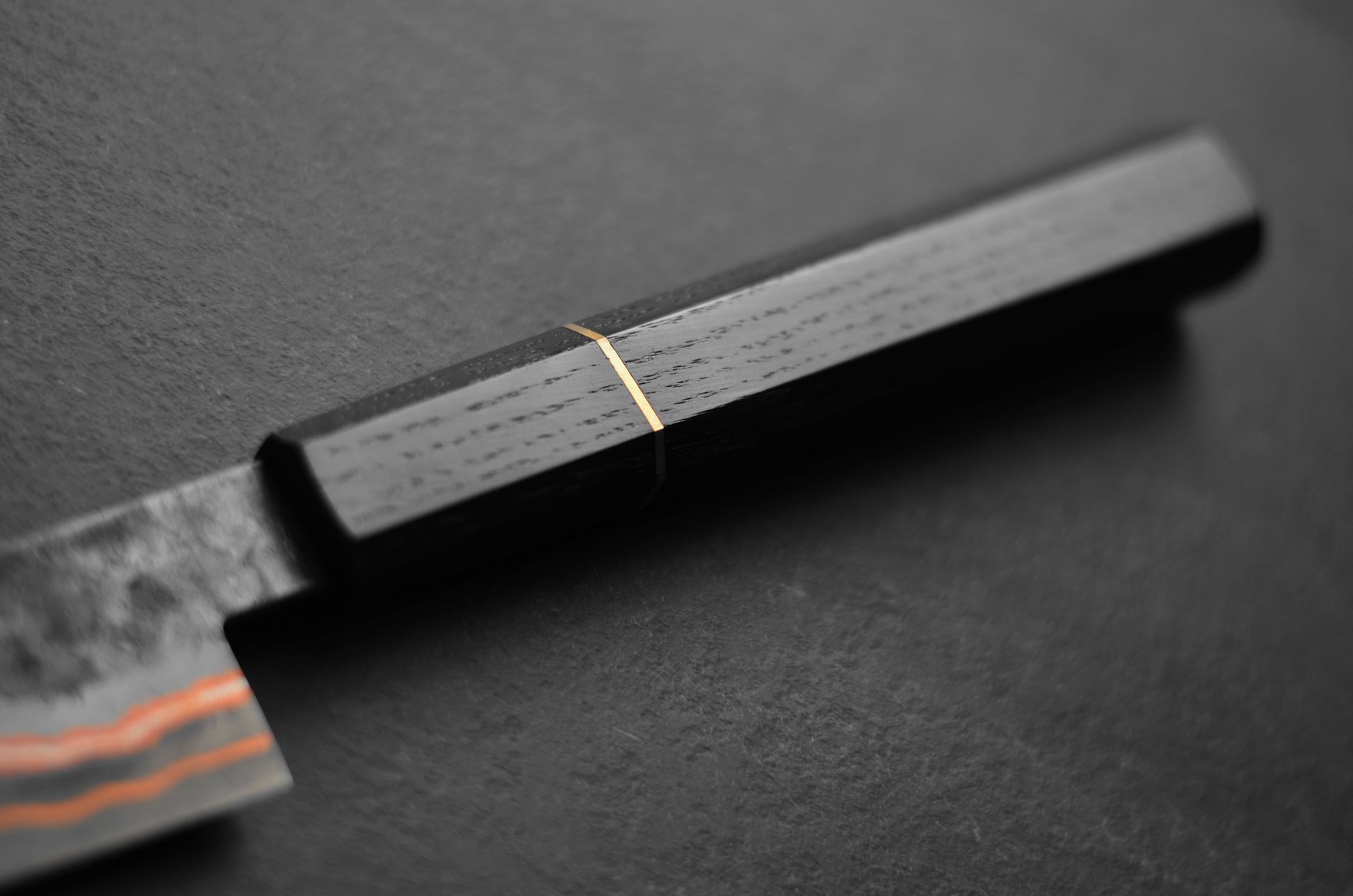 Lame forgée dans un acier damas à haut et bas carbone avec des couches de cuivre et de nickel pur. Acier de coupe en 90mcv8 (dureté 62HRC).